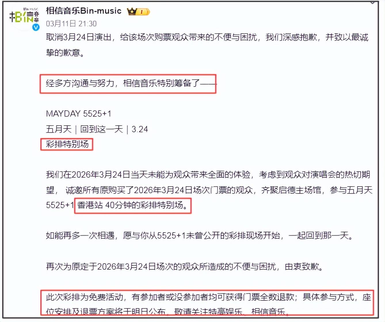 先来看五月天的回应,相信音乐发文表示给退票的观众致歉,经过多方沟通与努力筹备了“40分钟的免费彩排特别场”,安排时间是3月24日(原定的演唱会日期),无论参加与否都可获得门票全数退款,详细方案稍后公开。