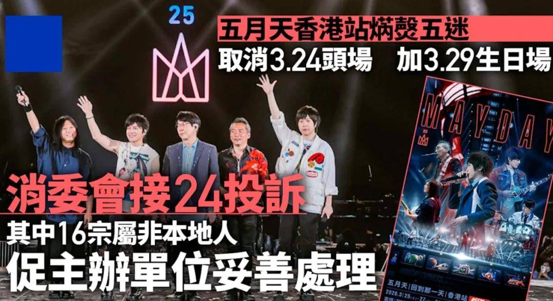 早前,五月天将原定于3月24日在香港举办的演唱会取消,理由是主办方为了“保障演出质量”,而后又在香港新增了一场成团纪念日演唱会。然而,关于取消演唱会的退票安排、机酒等方案并未安排妥当,请假和订了机酒的歌迷损失不少,引发巨大争议。他们采取投诉的方式维权,香港消协、香港海关及五月天官方都纷纷出面回应。