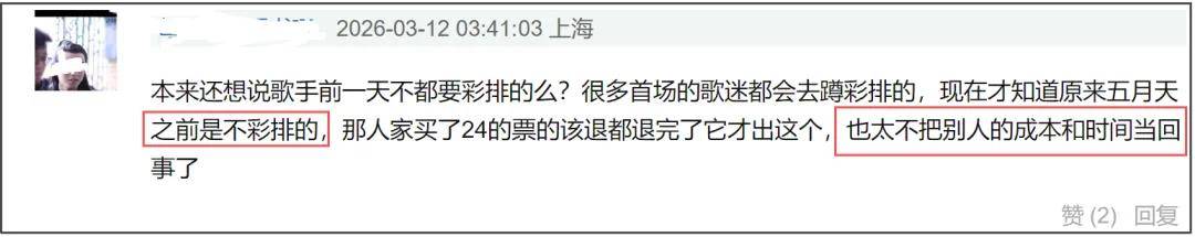 有香港歌迷直指五月天彩排场安排不稳当,路程太远,场馆要提前30分钟过去,来回车程要花两三个小时,结果只为了看40分钟。由此也能看出五月天的赔偿有多敷衍。而以此类推,本地歌迷都很难买账,更别说要花费大量机酒的内地歌迷了。